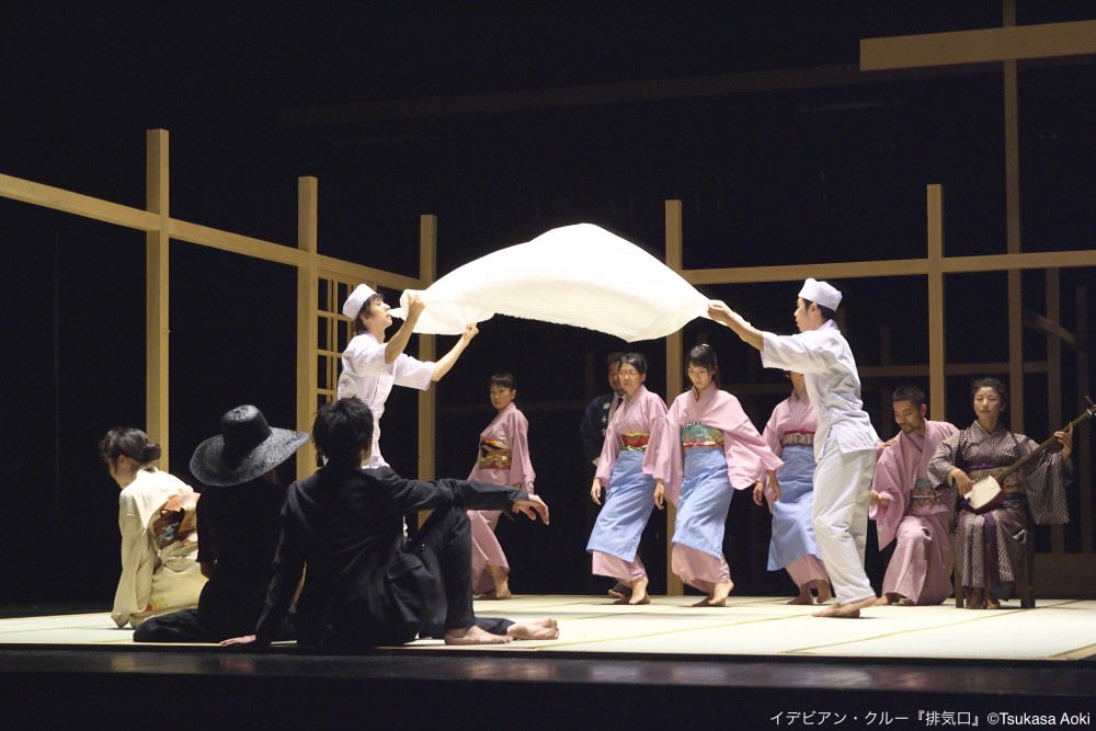 『排気口』は、ドイツのコンテンポラリーダンスカンパニー、ザ・フォーサイス・カンパニーの安藤洋子が出演したことでも大きな注目を集めましたが、今回も、井手と安藤の伝説のデュオは必見です。タイトルの“排気口”は、部屋の内と外、人の心の内と外など、さまざまな“内と外”をつなぐ存在の象徴。旅館を舞台に、群舞で魅せる仲居たち、かみ合わない板前たち、髪を振り乱して和服で踊るセクシーな女将(安藤)、そして神出鬼没な番頭(井手)と、個性的なキャラクターたちが、歌と踊りと妄想の世界を繰り広げます。