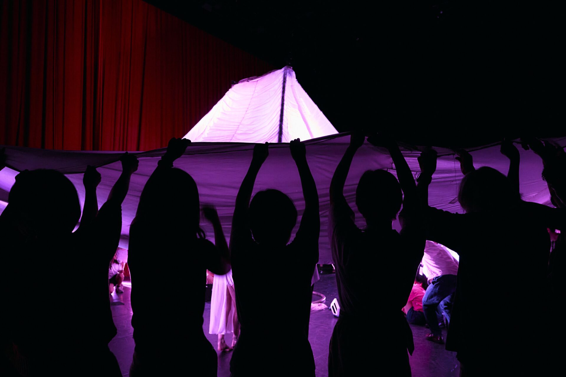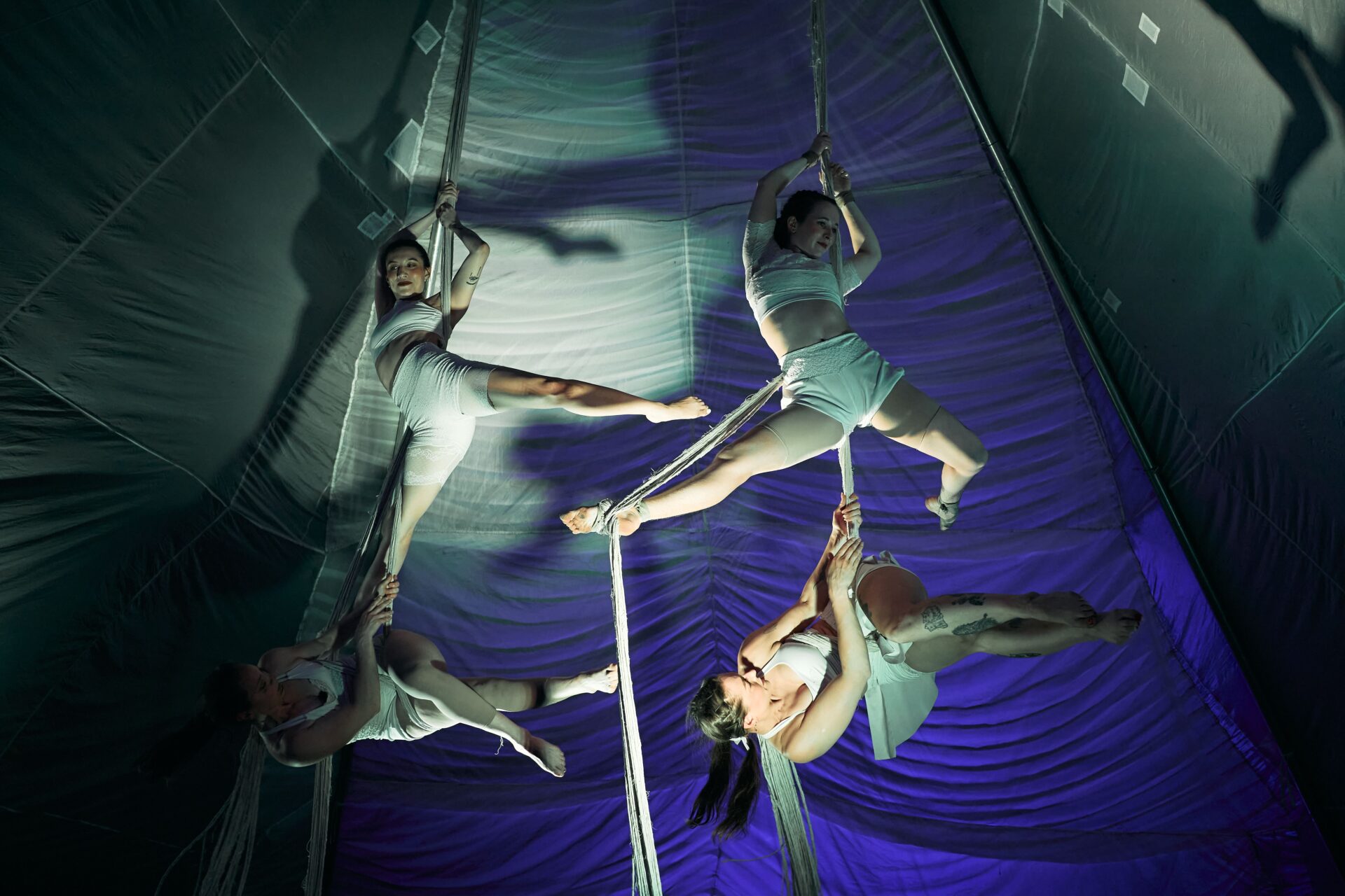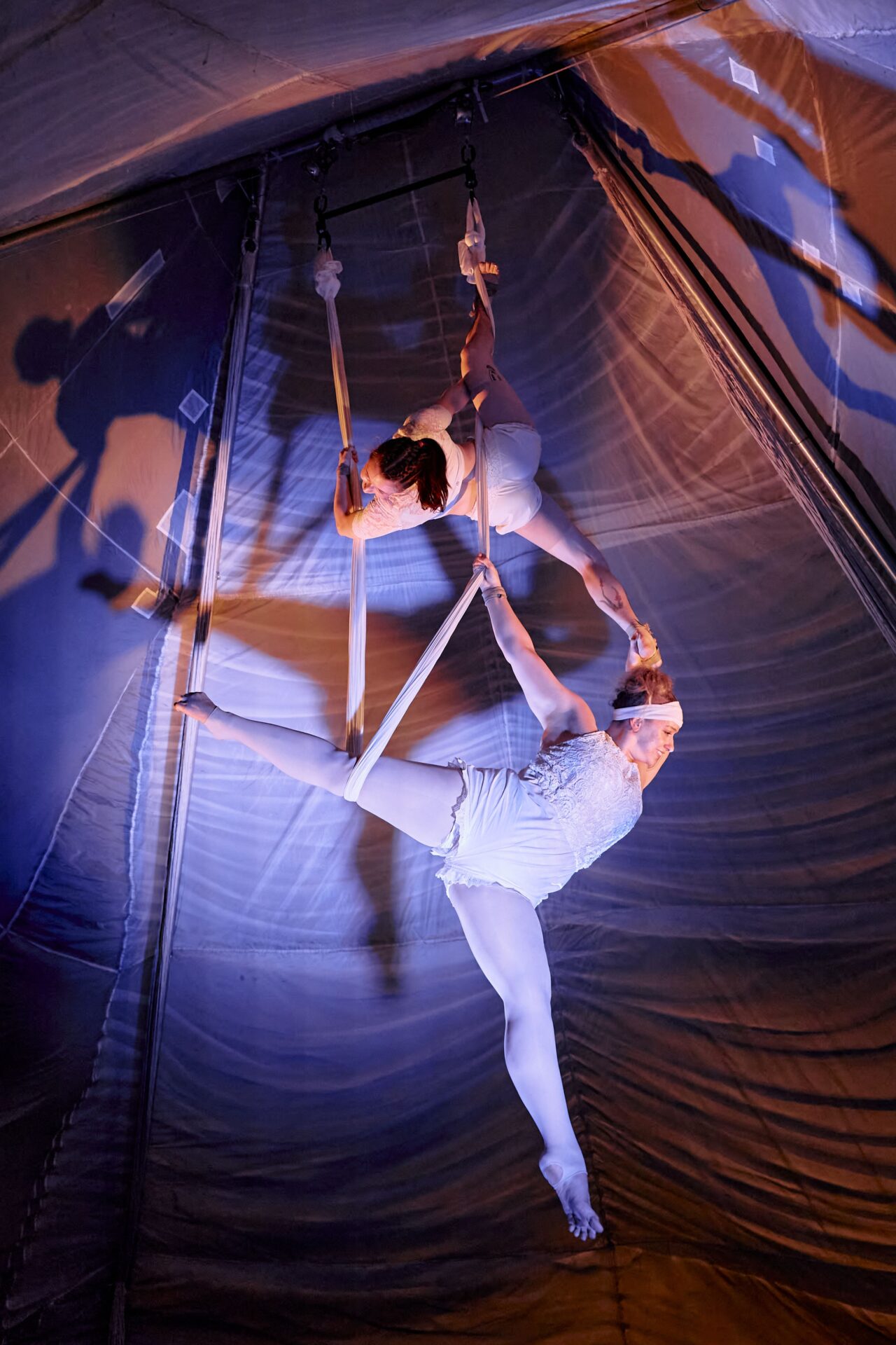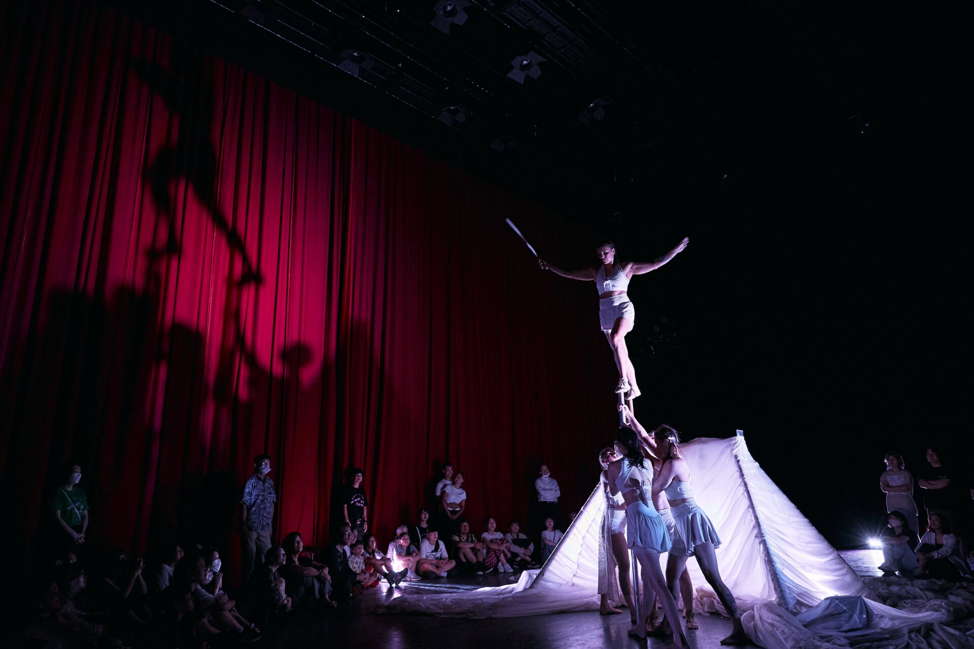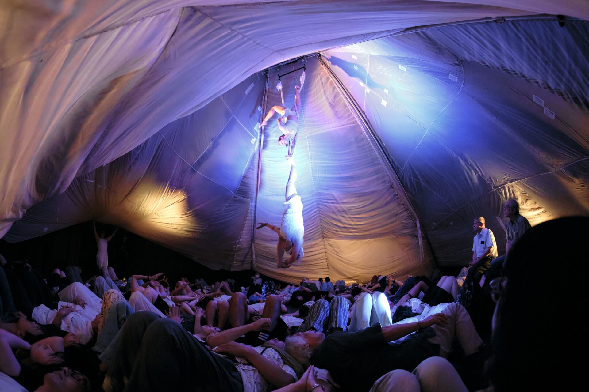 世田谷パブリックシアターのステージの上にテントをたてるところから公演は始まります。水たまりのように床に集まった布が広がっていき、小さなテントとなったその中で、シルホイール、デュオ ・トラピーズ、ジャグリングなど、美しくもハラハラと目が離せないパフォーマンスを繰り広げます。観客の皆様は床に座ったり、寝転んだり、時にはポールを支えたり組み立てながら、作品の一員となって舞台を一緒に作り上げていきます。