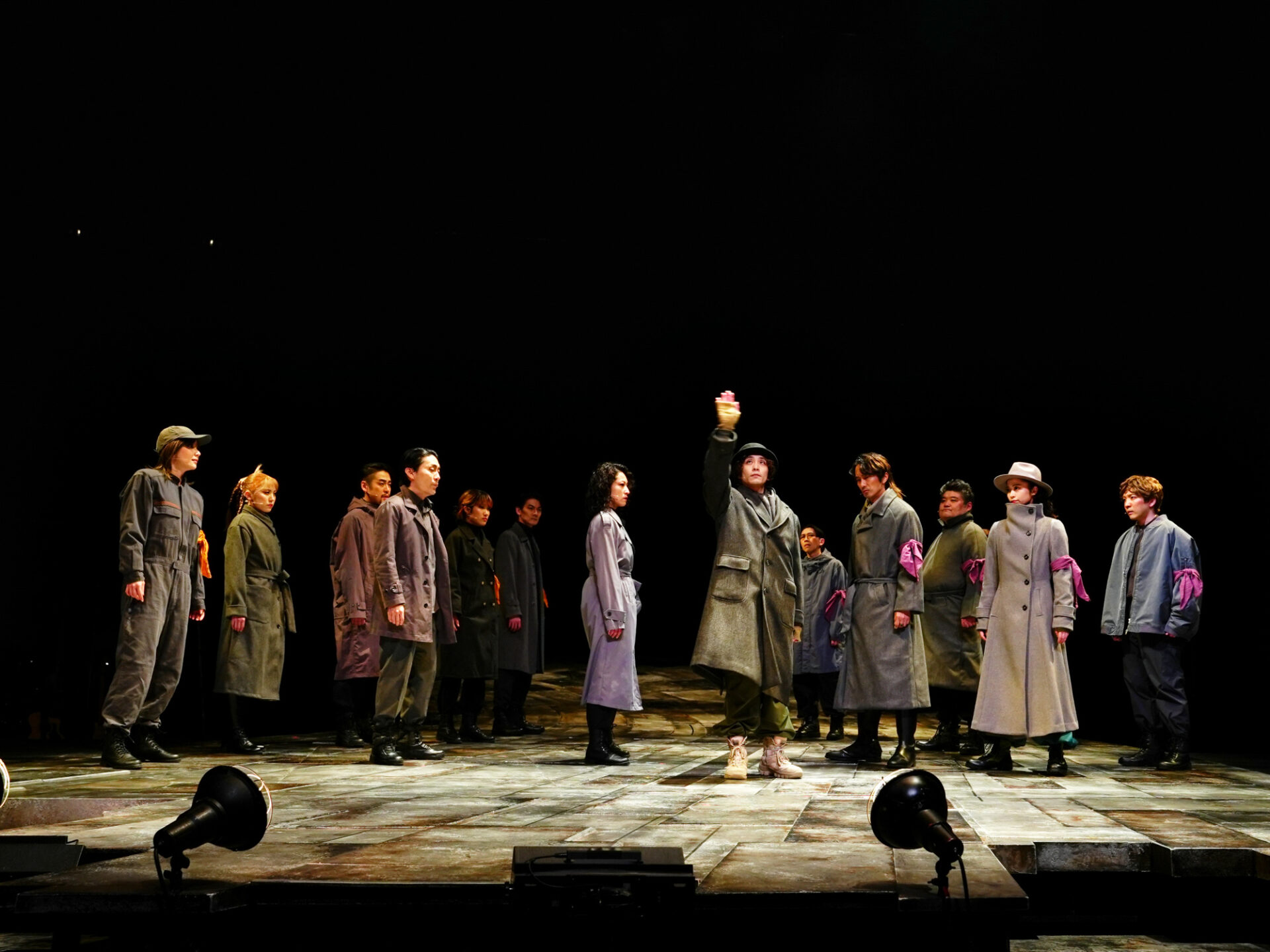 億万長者が支配し、シンギュラリティが起きてもまだ人間たちが己を信じてすがりつく、未来の見えない荒廃した世界。そんな中ミサイルが発射され……不穏な序幕、物語の導き手である歌手(一路真輝)がリードしながら、キャスト総出でエネルギッシュに歌うオープニング《クーデター》は強いビートが効いた迫力あるナンバーだ。