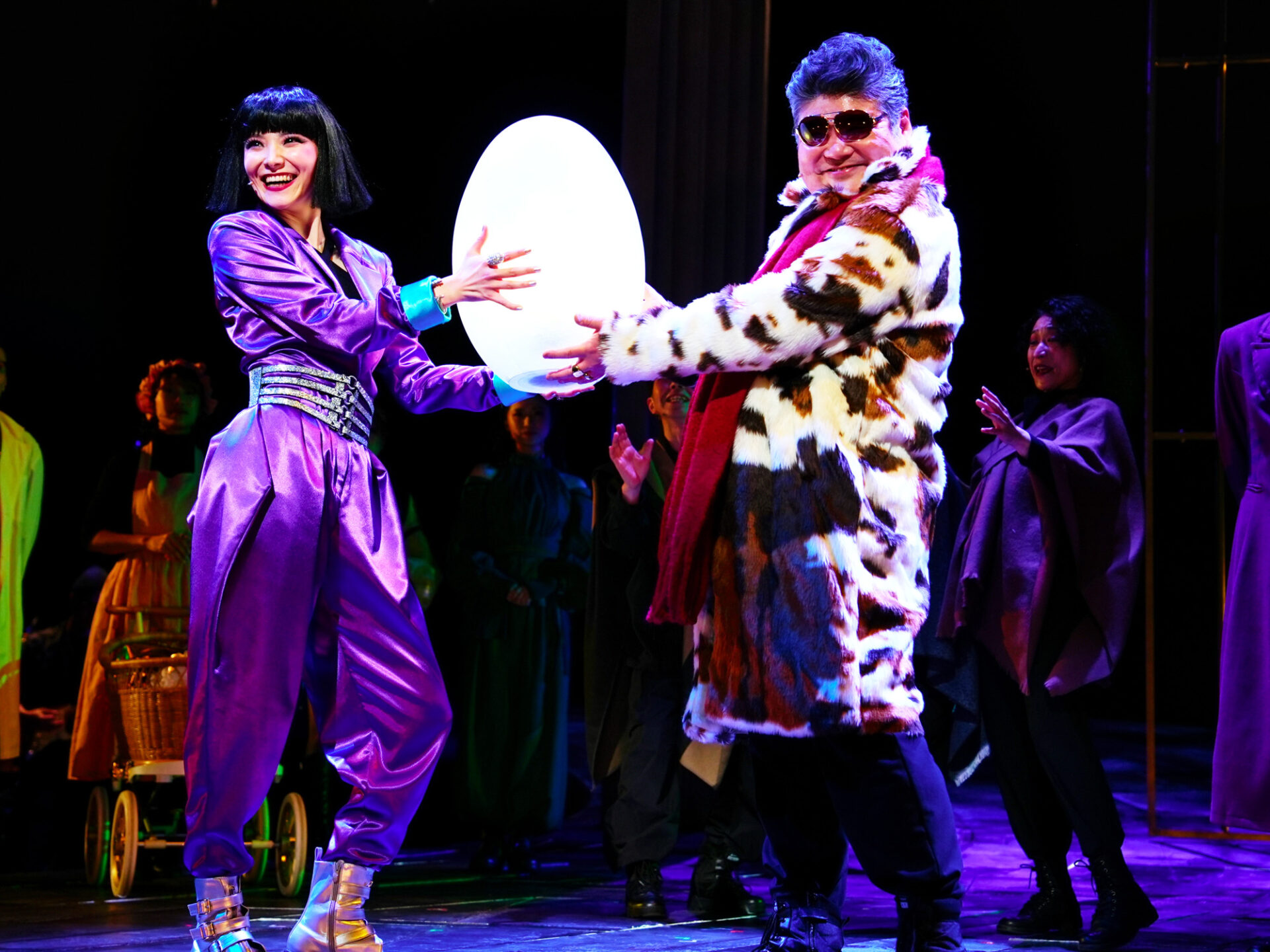 混乱のさなか、料理女グルーシェ(木下晴香)は戦地へ赴く兵士シモン(平間壮一)と結婚の約束をする。シモンと別れたグルーシェは、城から逃げ出す太守夫人ナテラ(sara)が巨大な卵型カプセル器に入った小さな受精卵を置き去りにするのを目撃し、友人の料理女スリカ(加藤梨里香)の制止を振り切り、見殺しにできない“こども”を連れて逃亡。ここで歌われる《あなたと逃げる》は、ヒロインであるグルーシェの心情にピッタリと寄り添う曲。リズミカルに手際よく、コミカルな表現で彩りながら、めくるめく展開で “瀬戸山版コーカサス”の世界観がしっかりと提示される。