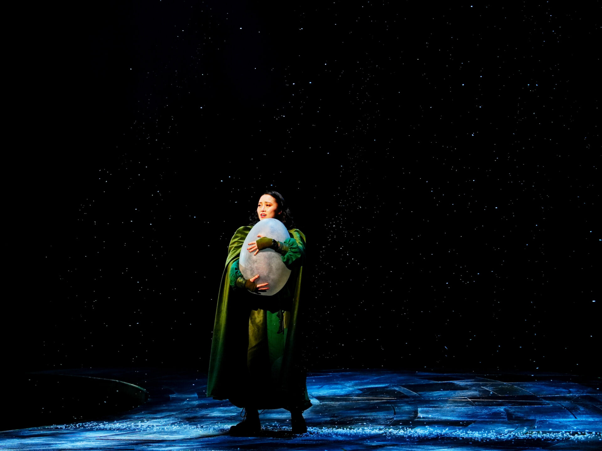 “こども”を可愛がってくれそうな農村の夫婦の家に、ひっそりと培養器を置き去りにするグルーシェ。農婦が愛おしそうに培養器を家に持って入るのを見届け、安心したグルーシェと歌手が掛け合いで歌うのが《わたし、うれしいの》だ。「身も心も軽いの、だからちょっと悲しいの」と相反する気持ちを吐露するグルーシェと、優しく寄り添うような歌手の対話は胸に沁みる。原作でもグルーシェが歌手から「街に帰る娘よ/やけにうれしそうじゃないか」と問いかけられ、「愛するあの子から解放されたから/ああ 心がはずむ(略)身も心も軽くなったから 悲しいの」(酒寄進一訳)と答える。矛盾した心理状態をうまく織り込んだ歌に、観客も心が揺れることだろう。