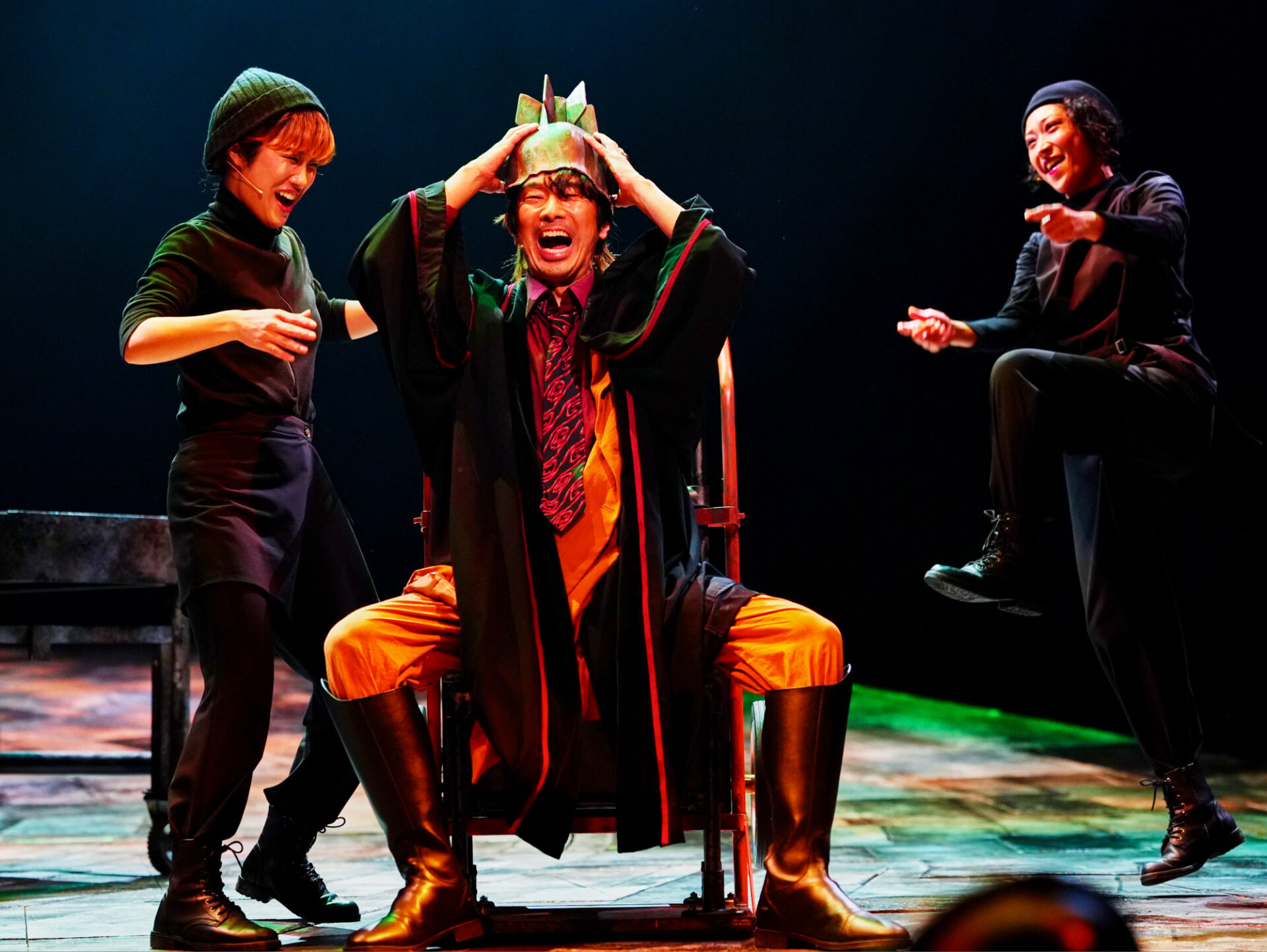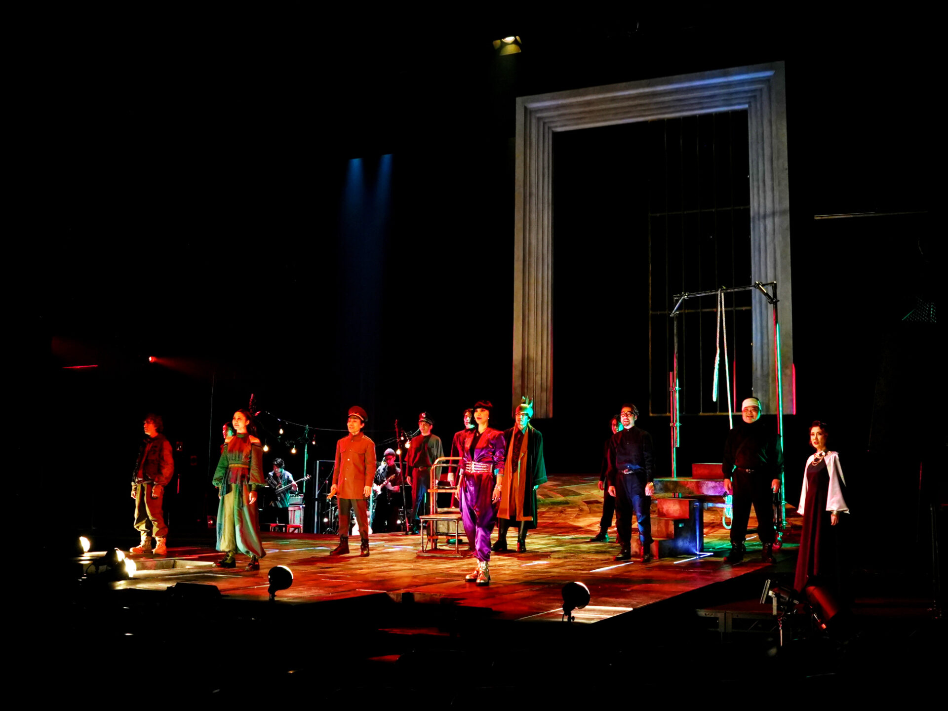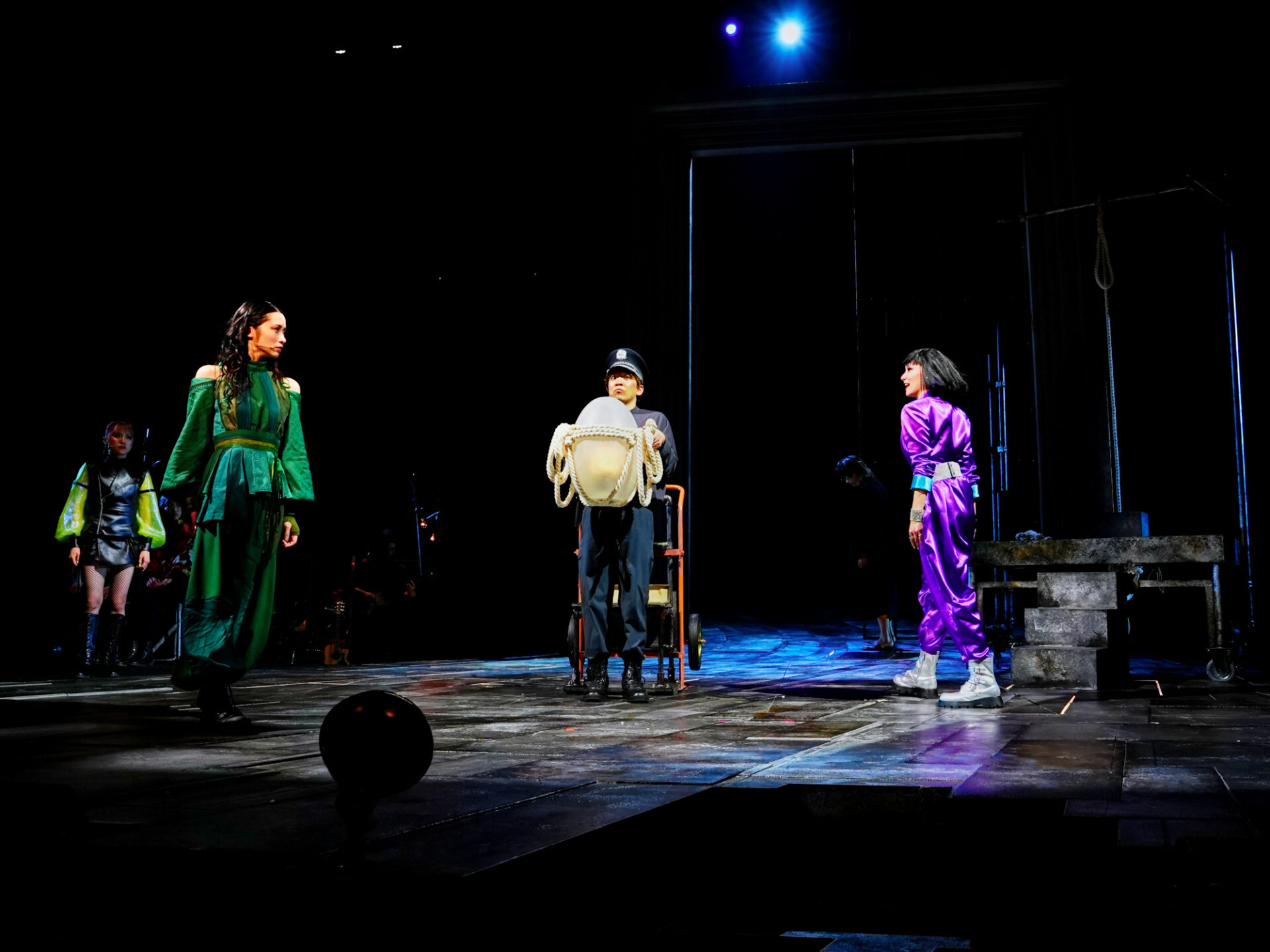幕が開いて音楽が鳴り、おそらく観客が最初に感じるのは、メロディーを聞いた途端「これは普通のブレヒト上演ではないな」と一瞬でキャッチできる斬新さだろう。演出家いわく「未来ではあるけれど、どこか80年代的な懐かしさもある。従来のブレヒト劇の常識にはとらわれず、ダンスミュージックとロックを混在させる――最終的に古今東西の参考曲を80曲ほどのプレイリストにまとめ、イメージを擦り合わせていきました」とのこと。確かに、ファンクでロックでディスコテック。踊り出したくなるようなノリの良さ、口ずさみたくなるキャッチーさ。舞台となる荒れ果てた世界に一見ミスマッチなキラキラとしたメロディーには、快い驚きと楽しさ、一種のアイロニーが満ちている。ブレヒトが提唱した “異化効果”は、あえて違和感あるものとして提示することで心理的距離を置かせ、観客に理性的な「観察」を促す効果を狙った手法。そう考えると、ここにも“瀬戸山流・異化効果”が横溢している。