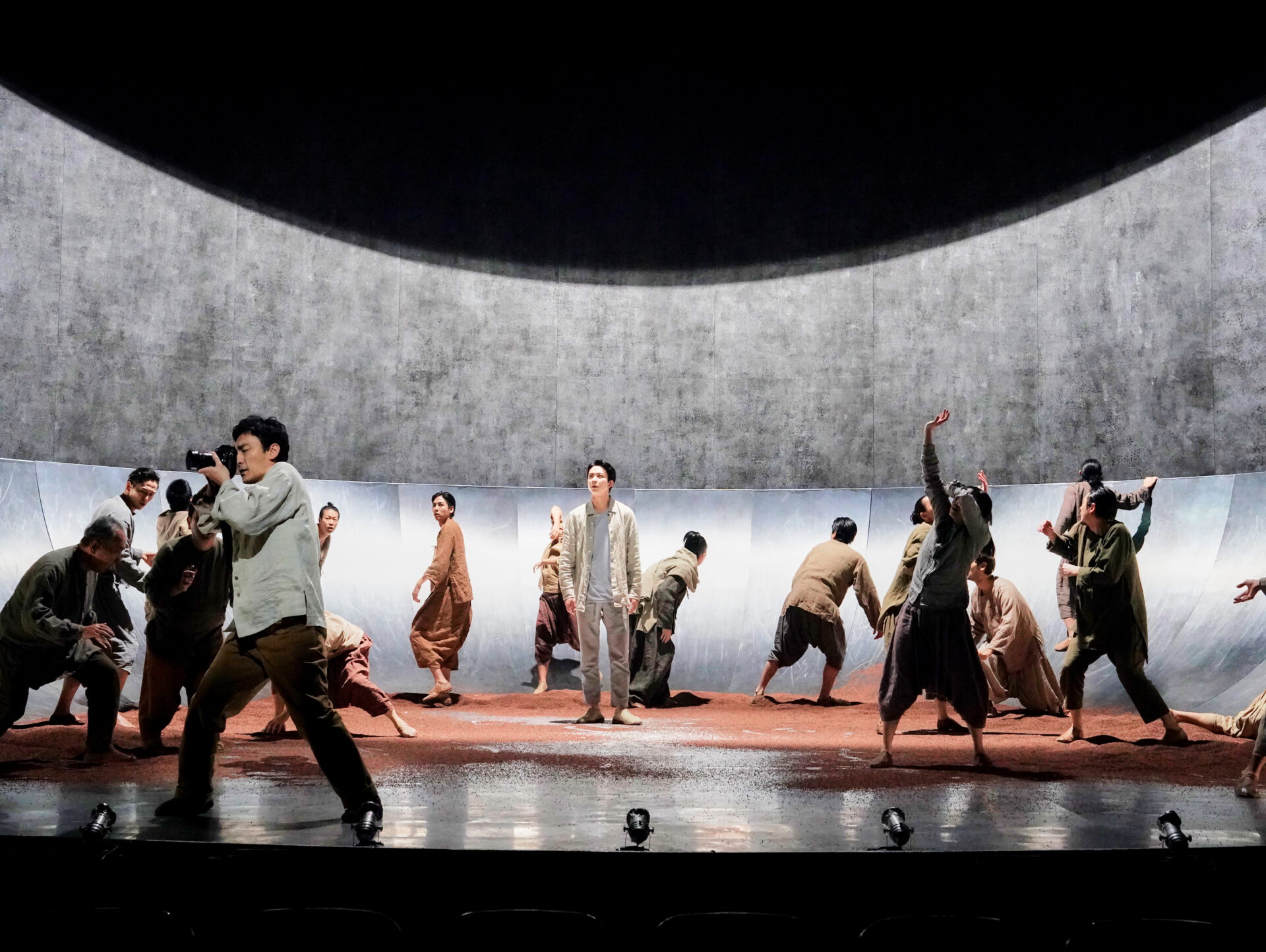 シッダールタが出会いと別れを繰り返しながら旅を続ける物語は、驚くほどにシンプルである。劇場に入ってまず目に入るのは、天井から突き出して光を放つLED照明、大きな穴の中で展開するような舞台美術だろう。役者たちは上段から滑り台のように下段に降りてきたり、一挙に駆け上がったりしながら、自在に舞台を駆け巡りながら演技をする。美術は時にスクリーンとなり、投射される映像に合わせてダンサーたちがしなやかな動物となって駆け抜けていく躍動的な美しさ! モダンな舞台空間に沙羅双樹の森、野生的な生命が宿っていくようだった。床に敷かれた砂が役者たちの動きによって散らされ、刻々と表情を変化させていく様も面白い。
